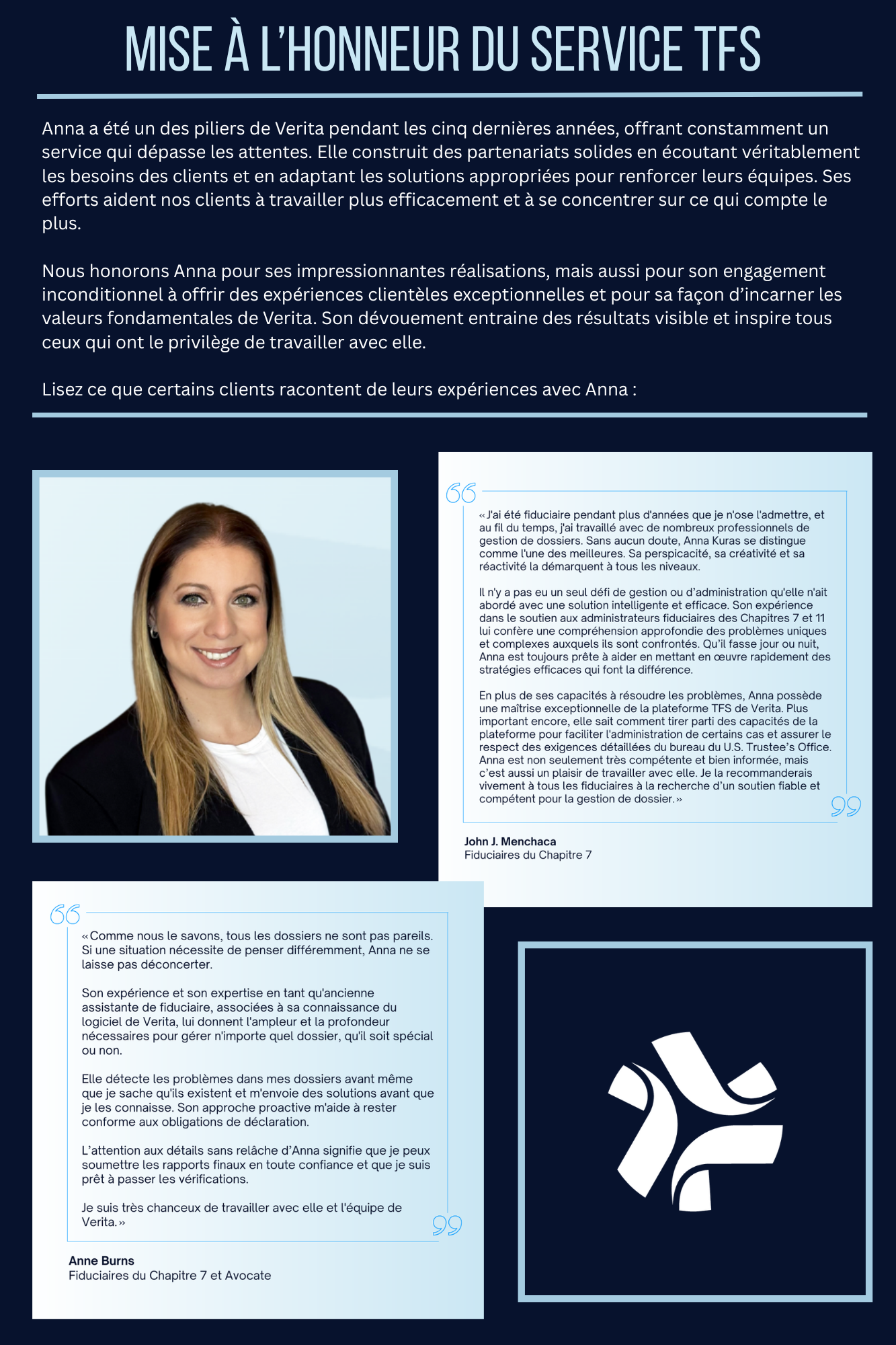 Les responsables des relations clientèles de Verita sont au cœur de notre expérience client. Ils cultivent un environnement rempli de confiance, assurant une certaine valorisation à chaque interaction. Leur dévouement et leur impact établissent une norme d’excellence, et nous continuons à célébrer leurs contributions pour nos équipes et pour nos clients, en honorant aujourd’hui Anna Kuras.